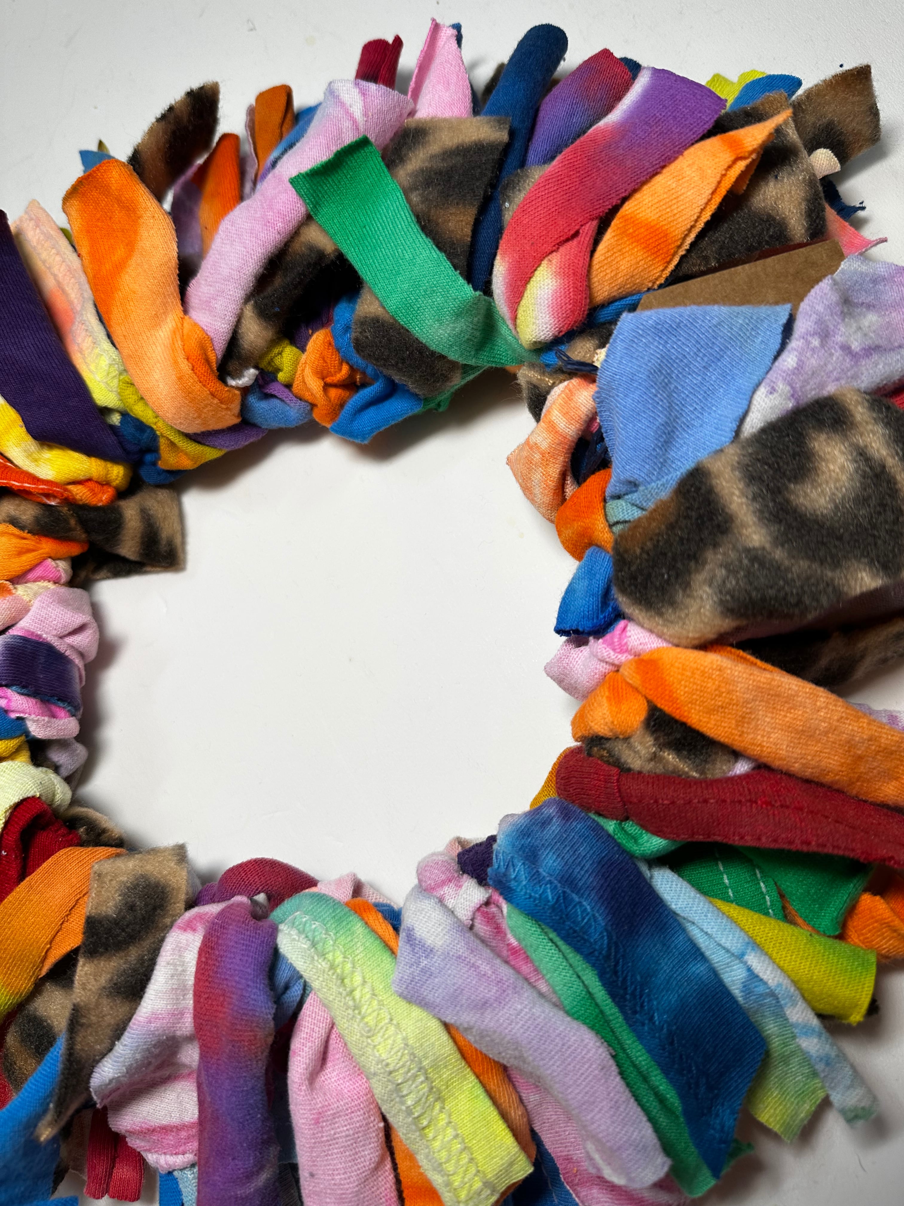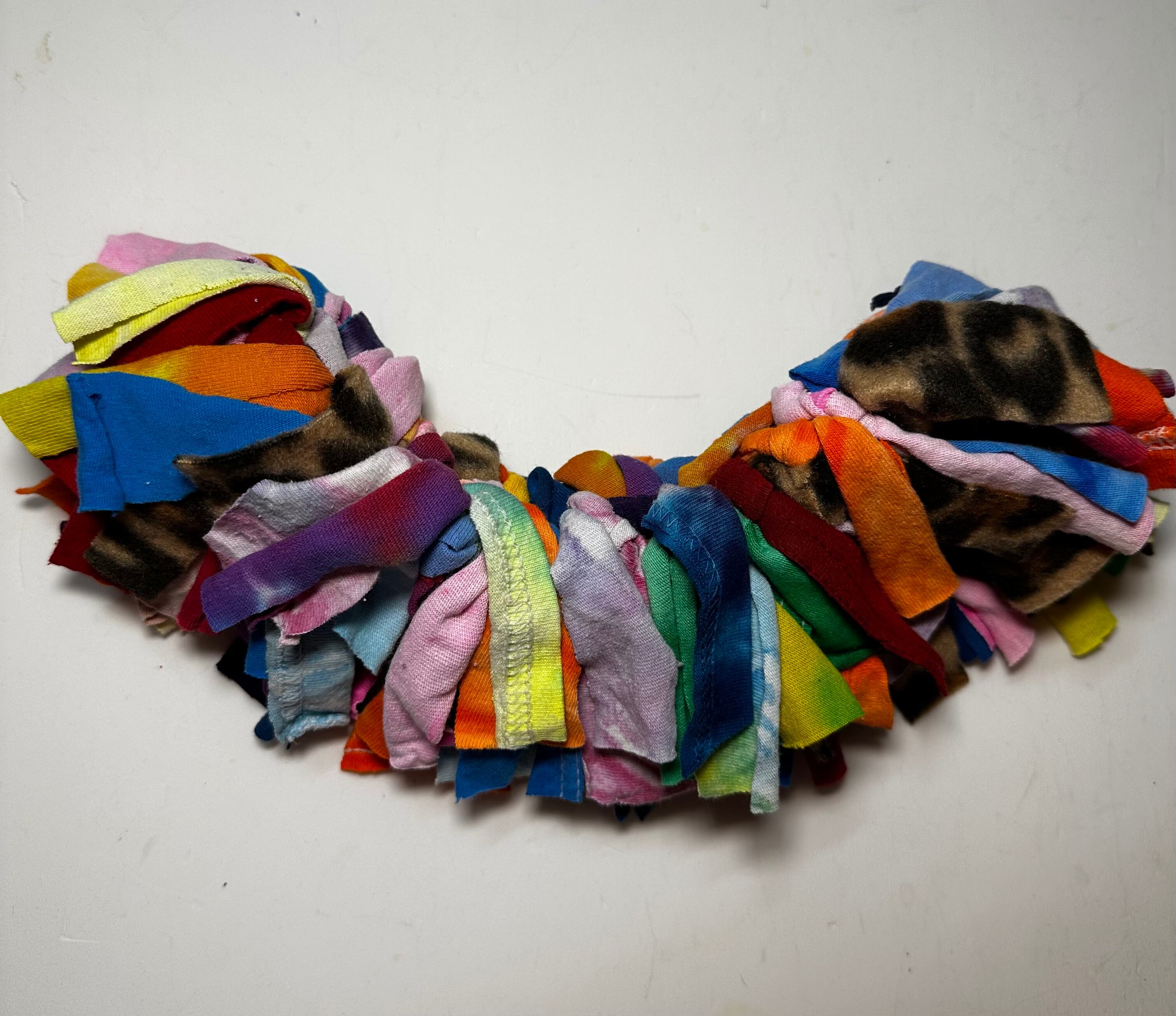 かわいい色合いの古着Tシャツのはぎれで首飾りを作りました。