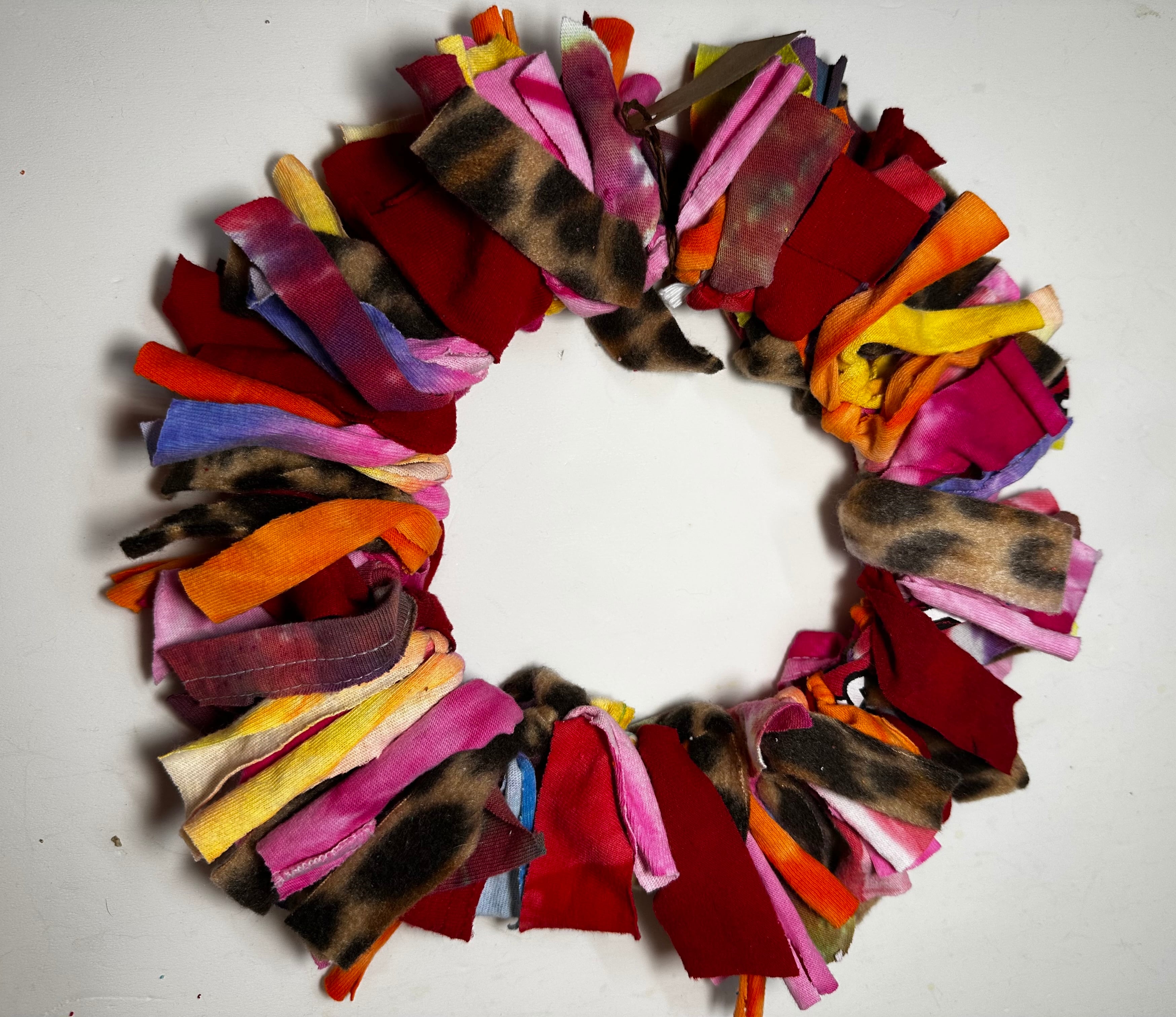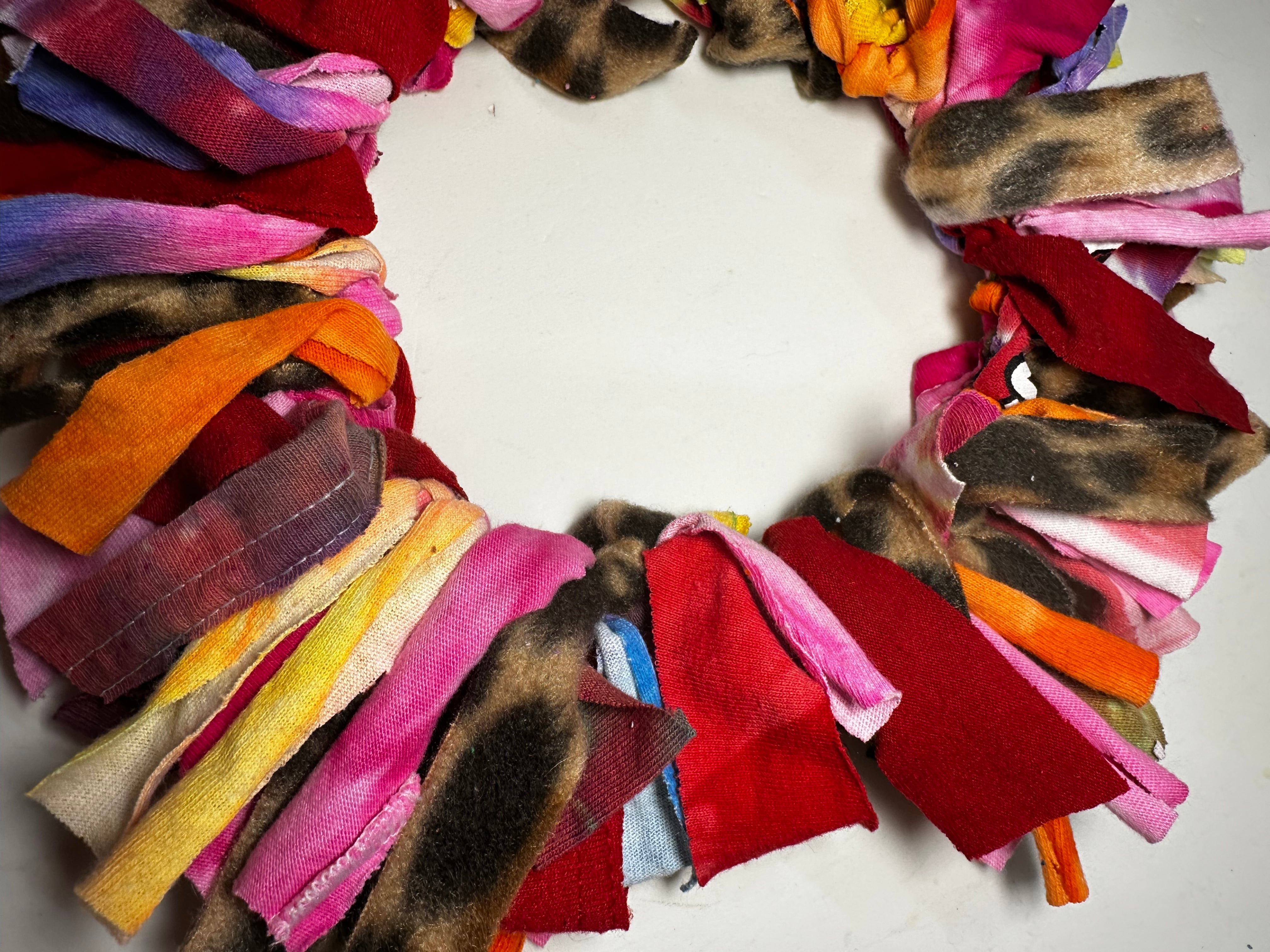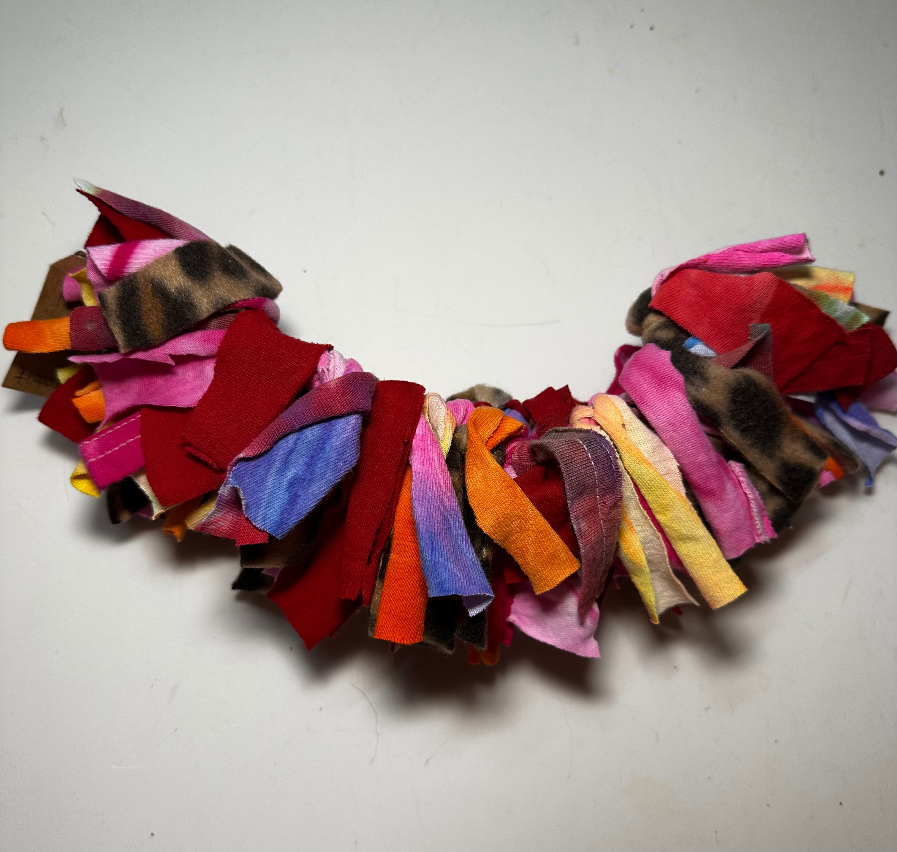 かわいい色合いの古着Tシャツのはぎれで首飾りを作りました。