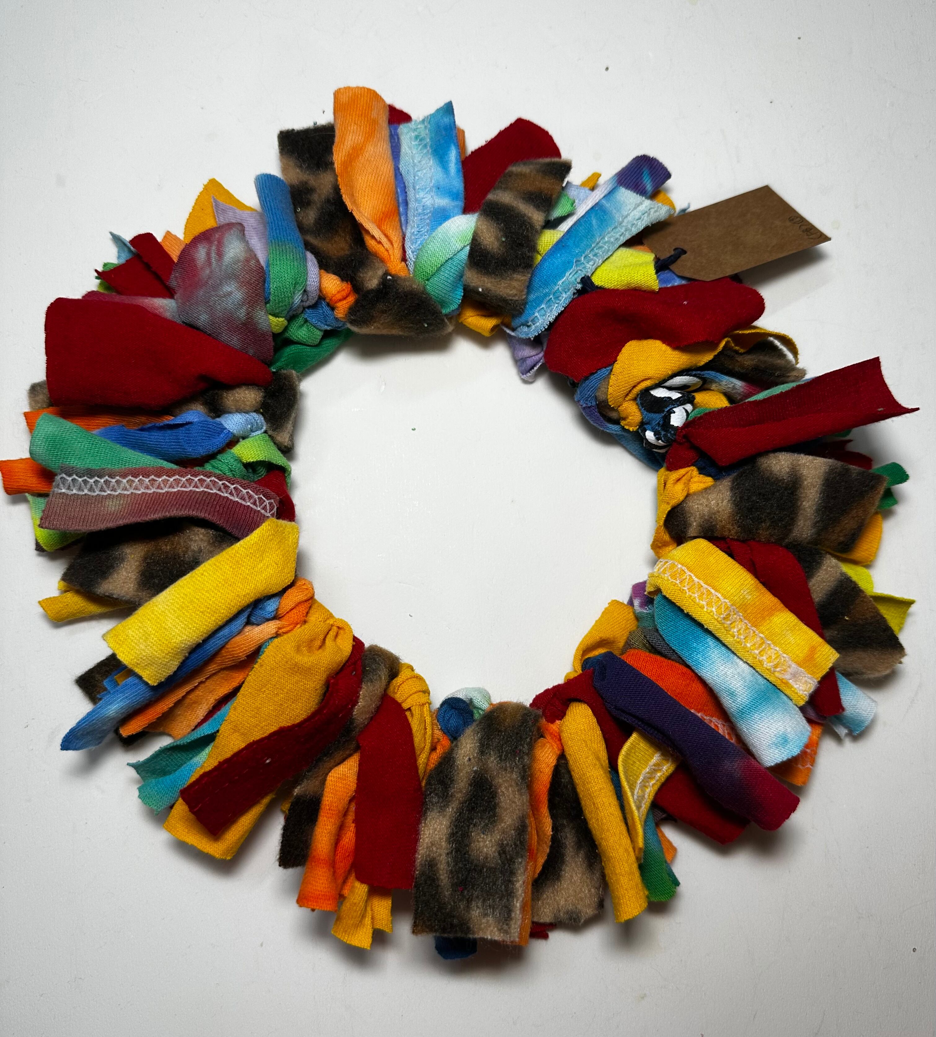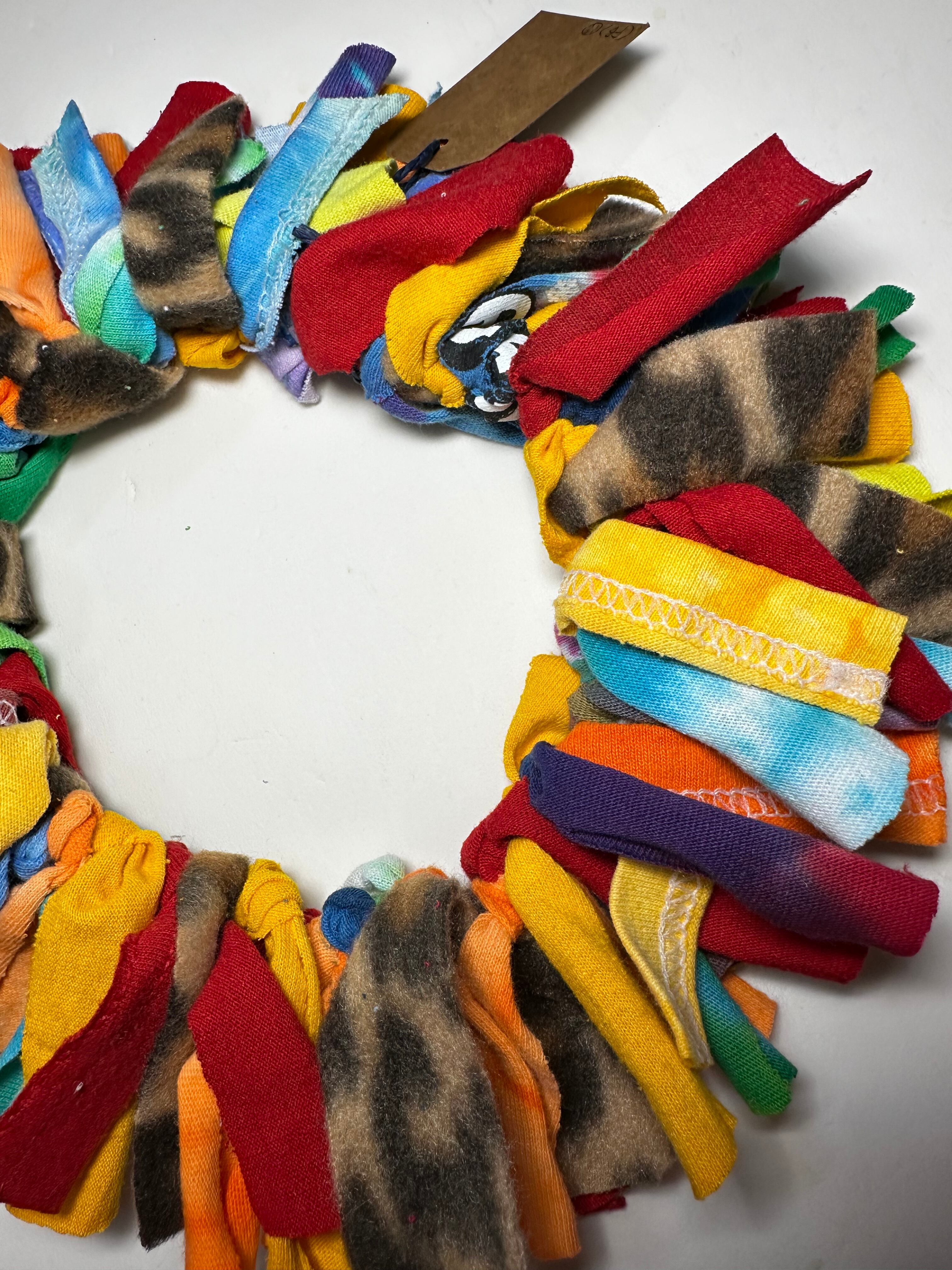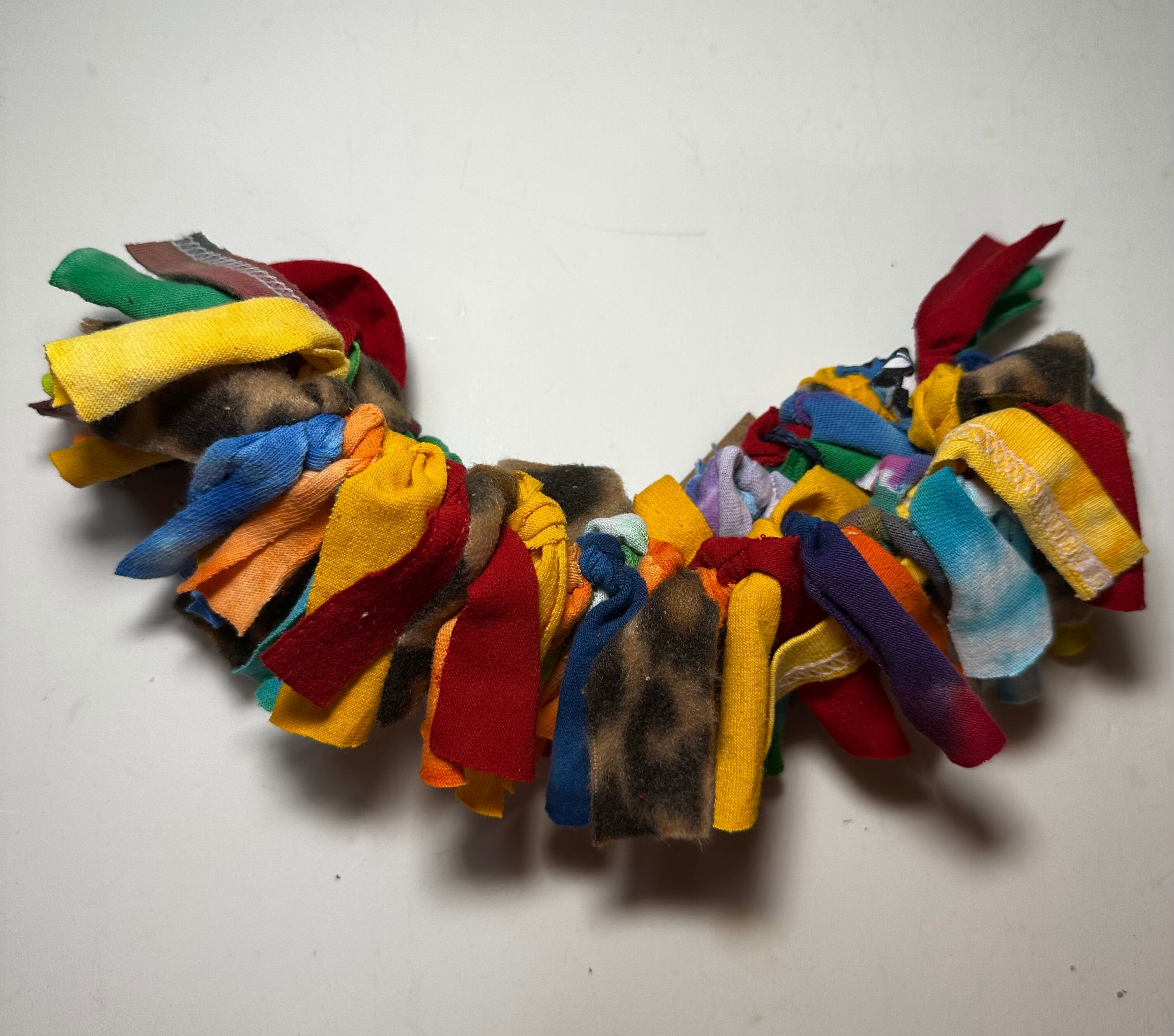かわいい色合いの古着Tシャツのはぎれで首飾りを作りました。